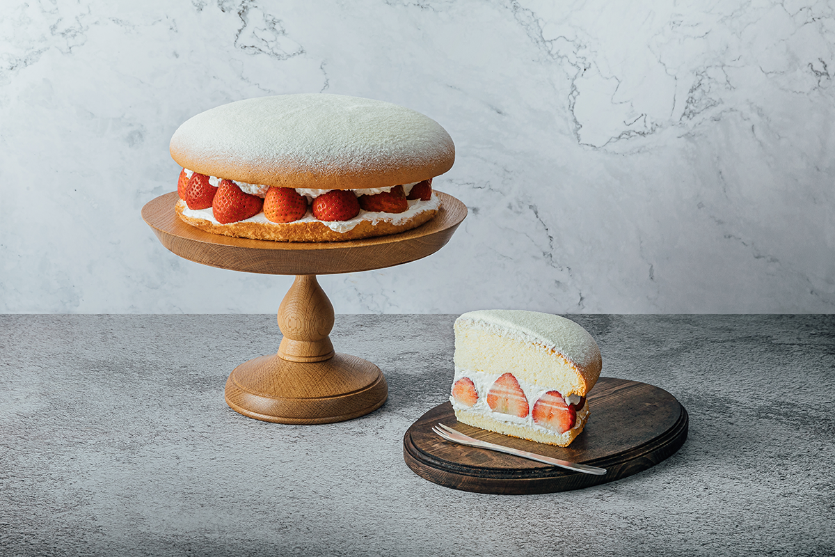 選用台灣大湖在地新鮮草莓,口感清爽順滑,搭配鐵塔鮮奶油內餡,分層疊加的鮮奶油夾心和香甜草莓、灑滿奶粉的圓弧雪頂霜飾,每一口都是品嚐到幸福的完美黃金配比。